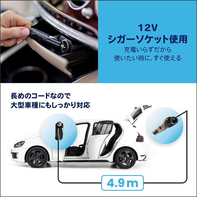 【便利】お掃除の時にバッテリーが切れたことはありませんか?このハンディー掃除機は、12Vのシガーソケットから電源供給します。4.88mのコードは、後部座席やトランクを掃除するのに十分な長さを確保しています。