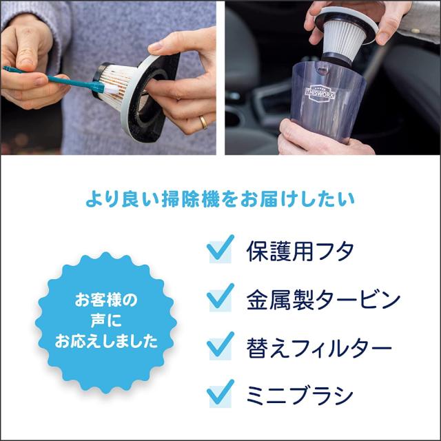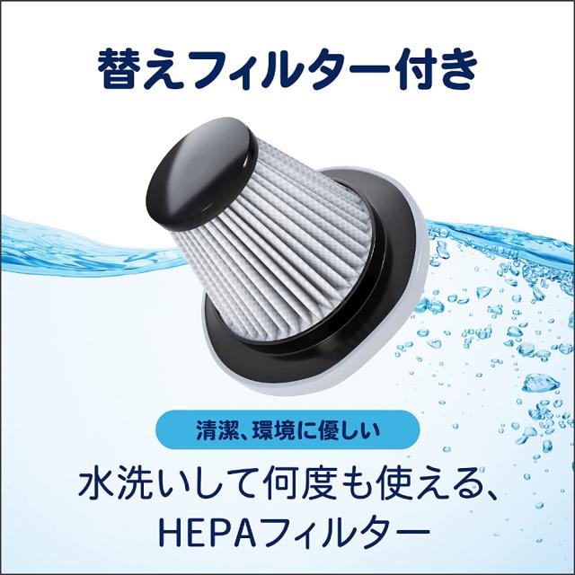 【強力】106Wモーターサイクロンの高い吸引力で、あらゆる粉塵やゴミを吸引。座席下に詰まった届かないゴミともサヨナラ。また、このハンディクリーナーには洗浄可能な最高級HEPAフィルターが搭載されています。