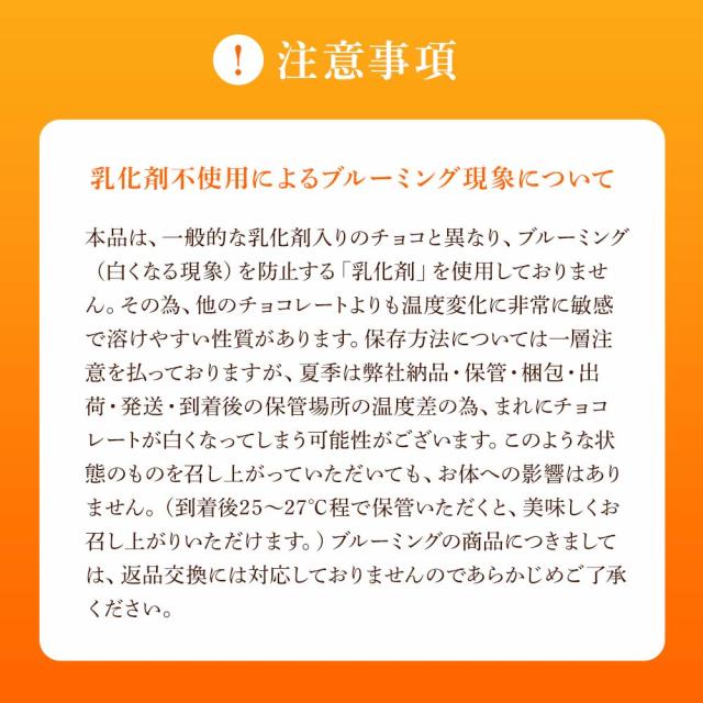 本品は、一般的な乳化剤入りのチョコと異なり、ブルーミング(白くなる現象)を防止する「乳化剤」を使用しておりません。その為、他のチョコレートよりも温度変化に非常に敏感で溶けやすい性質があります。保存方法については一層注意を払っておりますが、夏季は弊社納品・保管・梱包・出荷・発送・到着後の保管場所の温度差の為、まれにチョコレートが白くなってしまう可能性がございます。このような状態のものを召し上がっていただいても、お体への影響はありません。(到着後25〜27℃程で保管いただくと、美味しくお召し上がりいただけます。)ブルーミングの商品につきましては、返品交換には対応しておりませんのであらかじめご了承ください。
