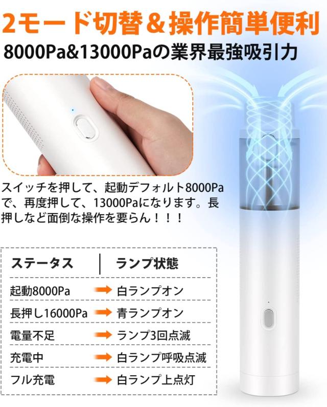 【2モード切替&長時間稼働】ハンディクリーナー 軽量のローモード8000Pa&ハイモード13000Paで、稼動時間と吸引力共にアップ!ハンディクリーナー コンパクトは起動時ローモードで、スイッチを短く押すと、ハイモードになって、共にランプ青色になります。ハンディクリーナー 充電式は業界最トップな5Cハイパワーバッテリーを搭載、5000mAhの大容量で、長持ちの上、安定まだ長時間稼働できます。(ご注意:正常充電や電池寿命を延長のため、5V/2A出力規格のアダプターご利用くださいませ)