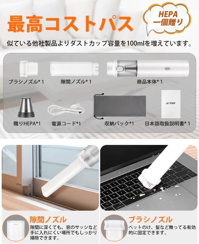【2022年ハンディクリーナー 軽量モデル】家の窓レールなど狭い場所の掃除は面倒すぎ、車の隙間とカップホルダーの掃除は手指が全然届かず、GOTIDYのハンディクリーナー コンパクトを利用すれば、腕を簡単で移動するだけで、汗臭い掃除をやめます。ハンディ掃除機として、440ゴラムの重さで、女性でも問題なく利用可能、ハンディクリーナー 充電式は人間工学のデザインで、もっと持ち便利になります。