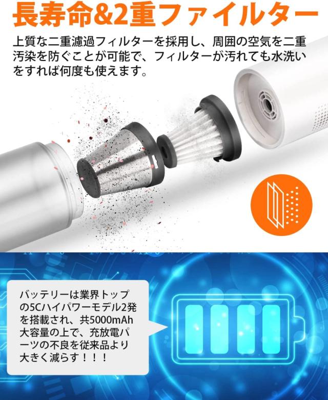 【二重フィルター】長時間ハンディクリーナー 充電式を使用すぎて、HEPAがウイルスなどの微生物が生れました。ハンディクリーナー 軽量はもう一つのHEPAセットを付いて、HEPAが水洗後、乾燥する前にハンディクリーナー コンパクトの使用を影響しません。