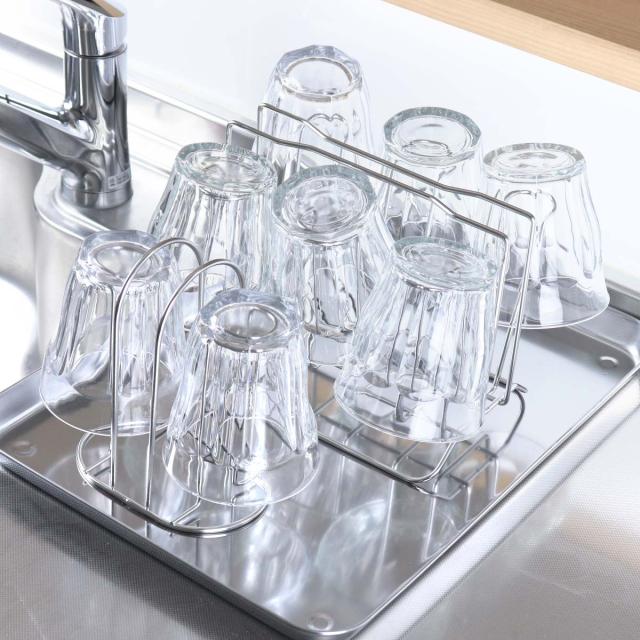 同シリーズにより多くのコップを収納できる「コップスタンド」があります。ご家庭や収納するコップの数に合わせてお選びいただけます。また、同シリーズのトレーを一緒に使用すると、シンク回りではない場所でも水切りができておすすめです。