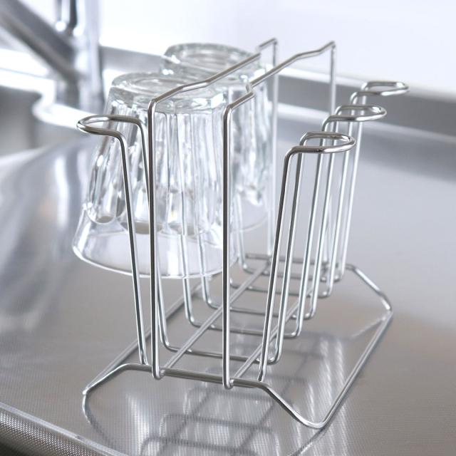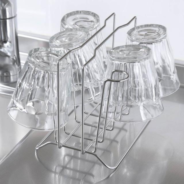 毎日使うグラスの水切りや収納に便利なコップスタンドです。空間を多くとらず、コンパクトに6個のグラスを収納できます。シンク周りや調理台・カウンター上だけでなく収納スタンドとしても使用でき、棚の中でごちゃつきやすいグラスもすっきり収納できます。耐久性に優れたステンレス製で変形しにくく、サビにくい特長もあるのでお手入れが簡単で長く愛用していただけます。