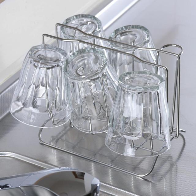 毎日使うグラスの水切りや収納に便利なコップスタンドです。空間を多くとらず、コンパクトに6個のグラスを収納できます。シンク周りや調理台・カウンター上だけでなく収納スタンドとしても使用でき、棚の中でごちゃつきやすいグラスもすっきり収納できます。耐久性に優れたステンレス製で変形しにくく、サビにくい特長もあるのでお手入れが簡単で長く愛用していただけます。
