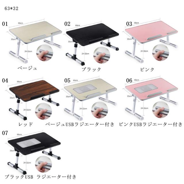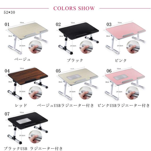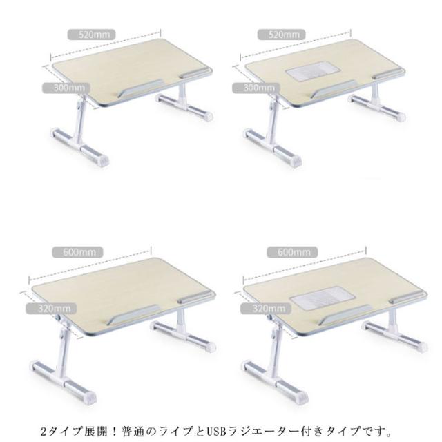 | ベッドや座椅子など様々な使い方ができる折りたたみテーブル。 2タイプ展開!普通のライプとUSBラジエーター付きタイプです。 テープル高さは4段階調整:24〜32cm、角度は4段階:0~36°調整できます。寝転んだ座ったりと様々な状況に対応! 天板は汚れに強い素材を使用しているので、水や飲み物をこぼしても、サッと拭けてお手入れもラクラクです。 両方の足を内側に折るだけでコンパクトになります。 コンパクトでベッドやソファー下、隙間への収納可能。 ノートパソコンスタンドだけではなく、子供用ダイニングテーブル、ベッドテーブル、タブレットスタンドとしても使えます。 | |