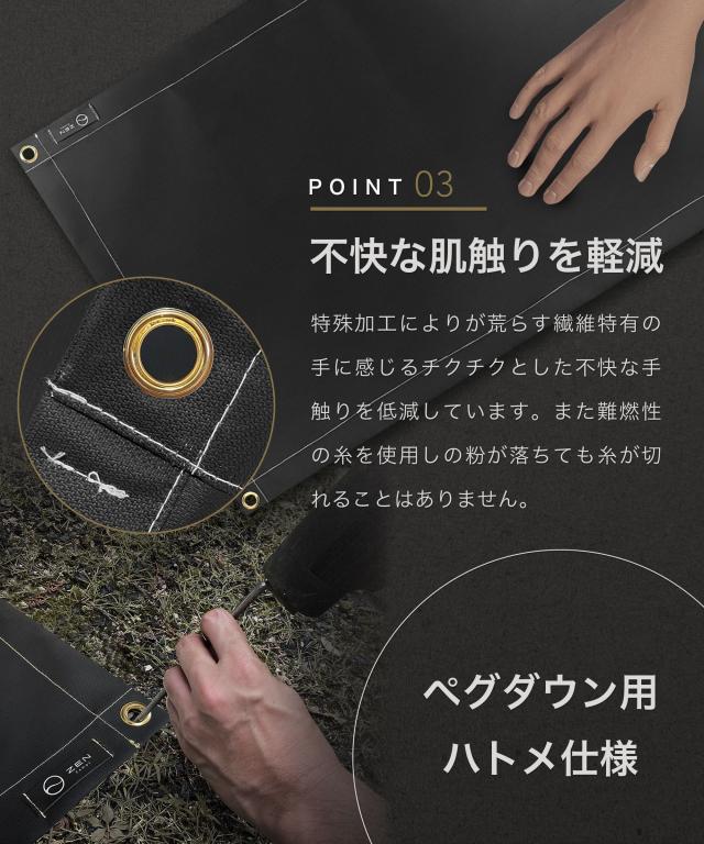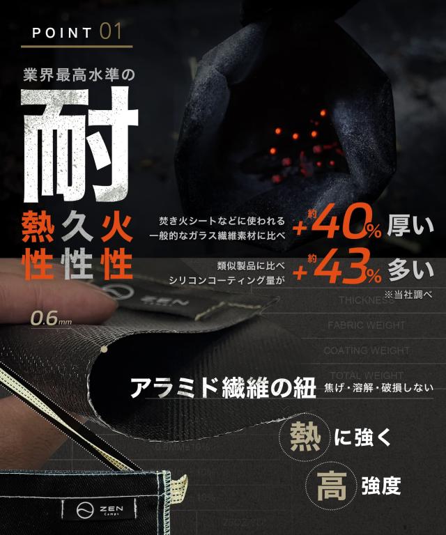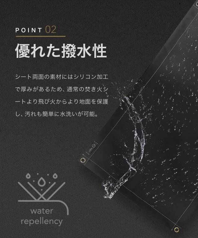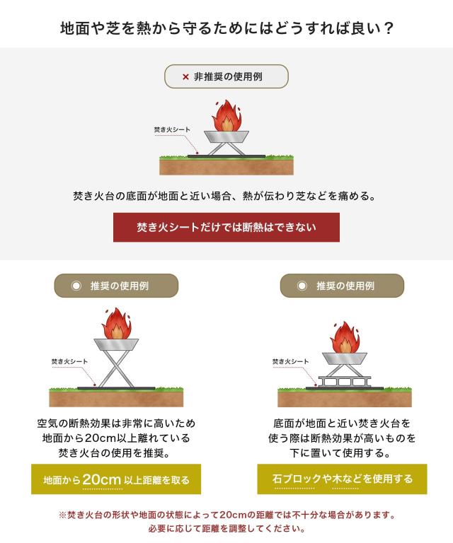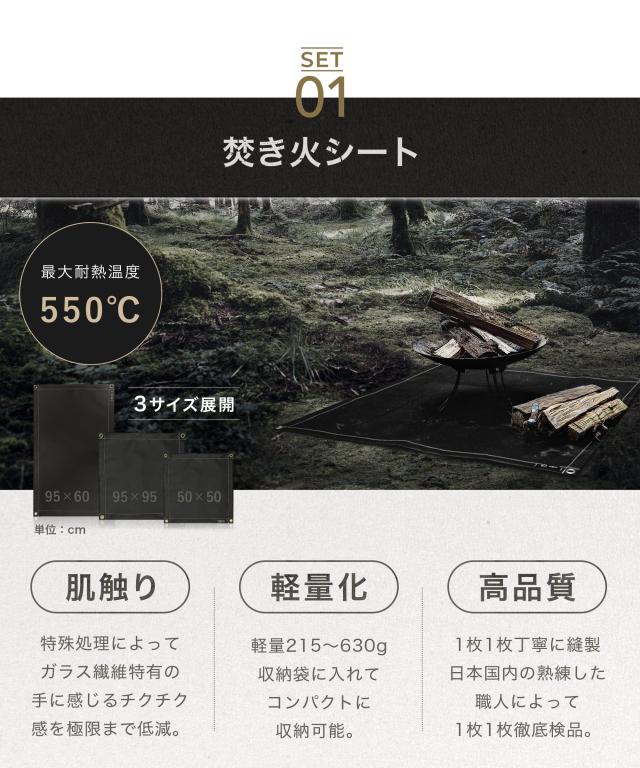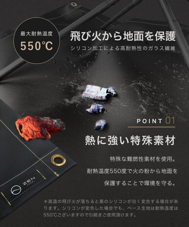 たき火時の専用シートとして開発され、耐熱温度約550℃で熱に強く、焚き火台から発生する放射熱を遮り火の粉や燃えかすがこぼれた時に地面や芝、ウッドデッキ等のダメージを軽減します。地面を焦がさず環境に配慮しながら焚き火をお楽しみください!