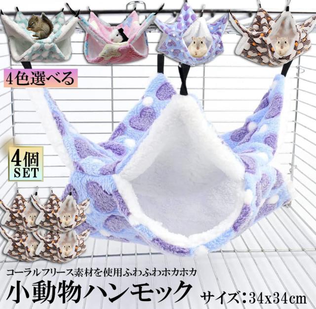 小動物 ゲージ ベッド ハンモック 4枚セット 小動物ハンモック ハムスターハンモック 34x34cm モルモット ペットの家 デグー フクロモモンガ ハムスター マウス 小鳥 ハリネズミ フック付き 寝床 寝袋 暖かい 保温対策 ふわふわ
