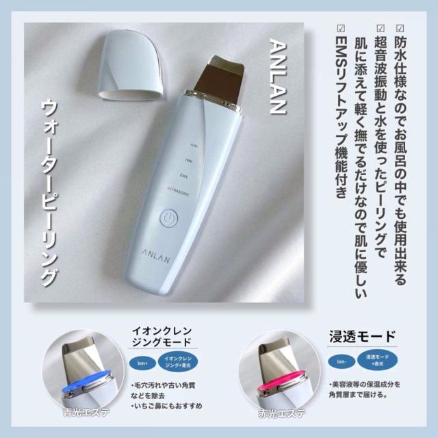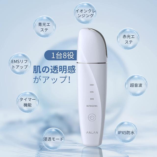 【1台8役、肌の透明感がアップ】イオン-、イオン+、赤光エステ、青光エステ、EMS、超音波、IPX5防水、タイマー機能を搭載します。水と超音波の力で、毛穴汚れや古い角質などをオフします。毛穴詰まりなどに悩んでいる方には特におすすめです。