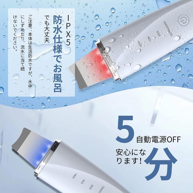【防水ウォーターピーリング】IPX5防水仕様で、お風呂でも大丈夫です。5分自動電源OFF機能も付き、安心して使用することができます。※ご注意:本体は生活防水ですが、水中にしずめたり、流水に当て続けないでください。