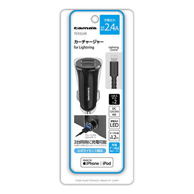 2.4A出力のLightningコネクタ用セパレートタイプの車載充電器。2.4A出力。