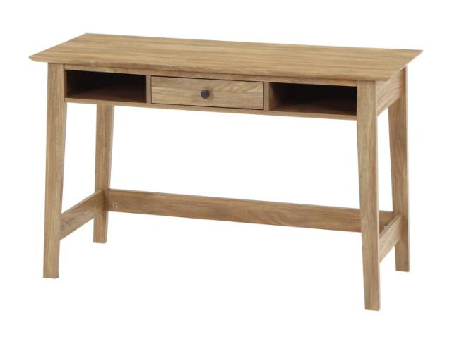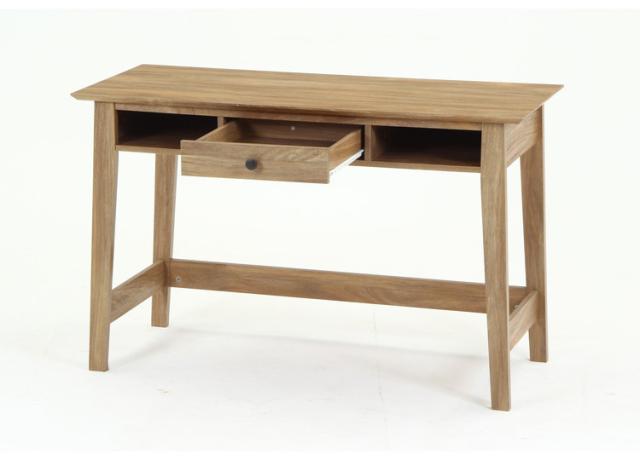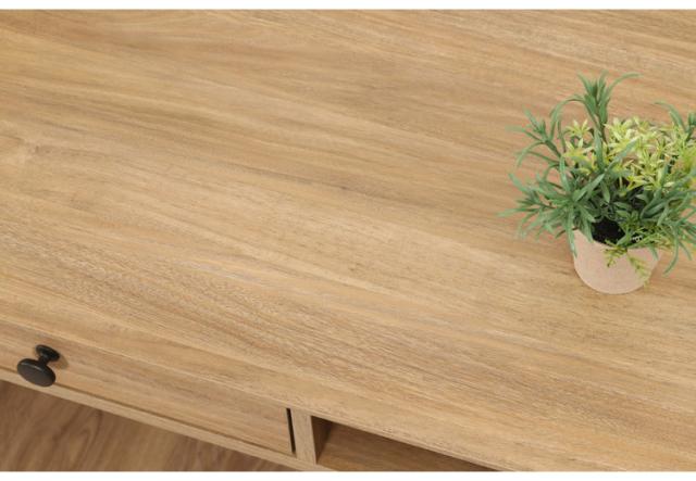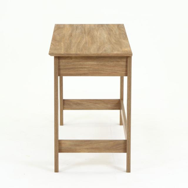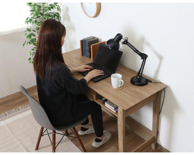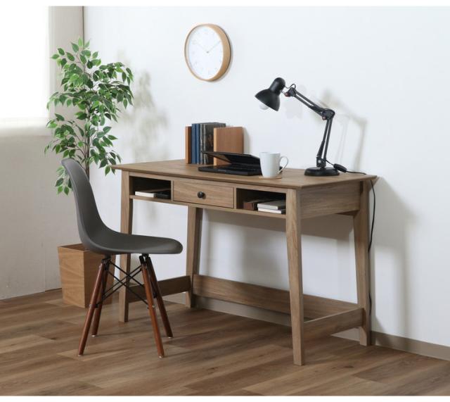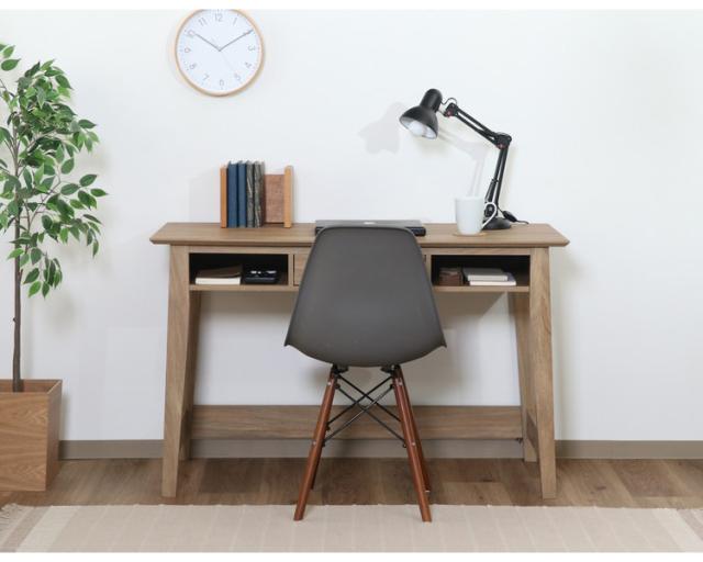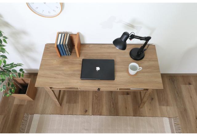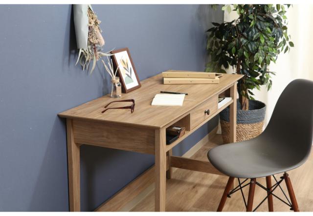 まるで天然木を使用したかのような、木目が美しいオークのプリントが施されたデザイン。幅120×奥行51cmの天板は、パソコンとノートを広げてもゆったり使えるサイズです。内寸幅31×奥行45.8cmの引き出しには、文房具などの小物を収納できます。スライドレールなので引き出しやすさも◎引き出しの両サイドには幅33×奥行38.5cmのオープン収納。サッと取り出したいものなどは、ここに収納すると便利。一般的なチェアとも合わせやすい高さ72cm。足元も広くスッキリと。表面の木目が美しく、可能な限りネジ穴が見えないよう工夫されています。