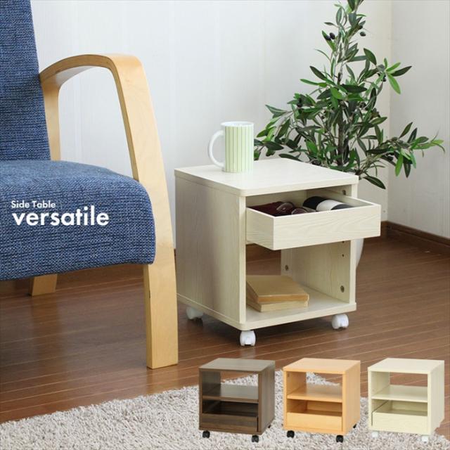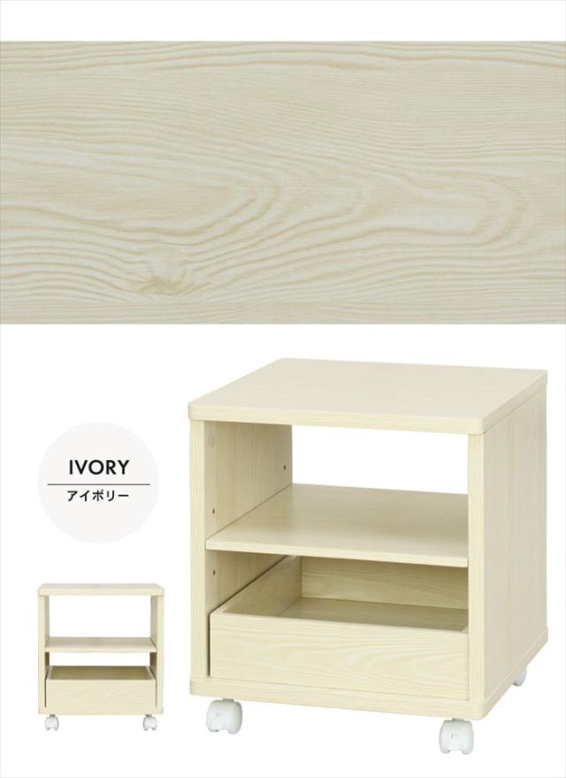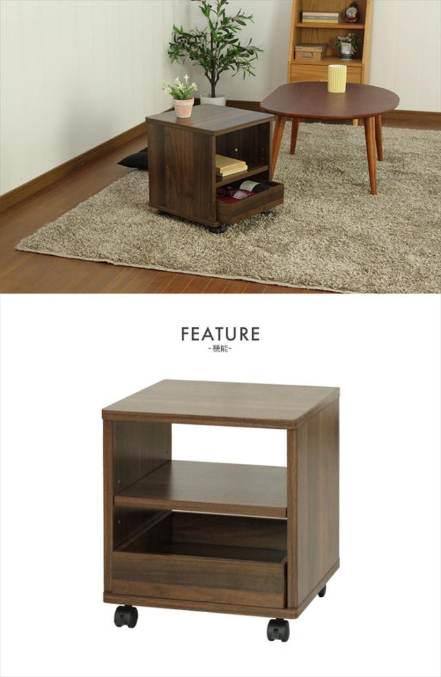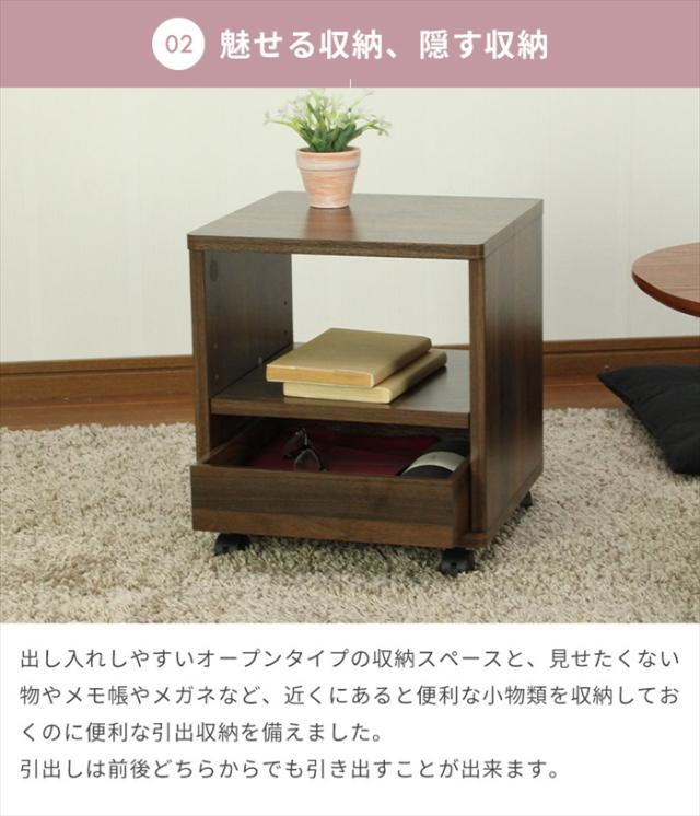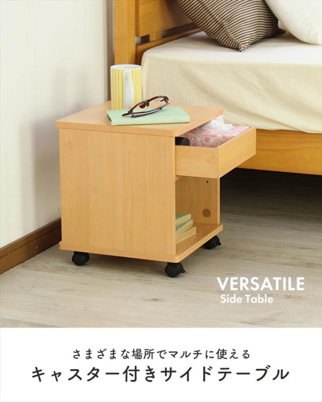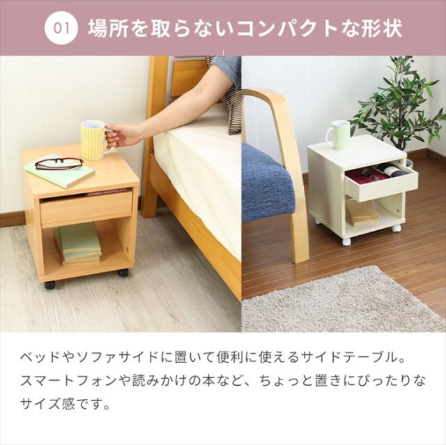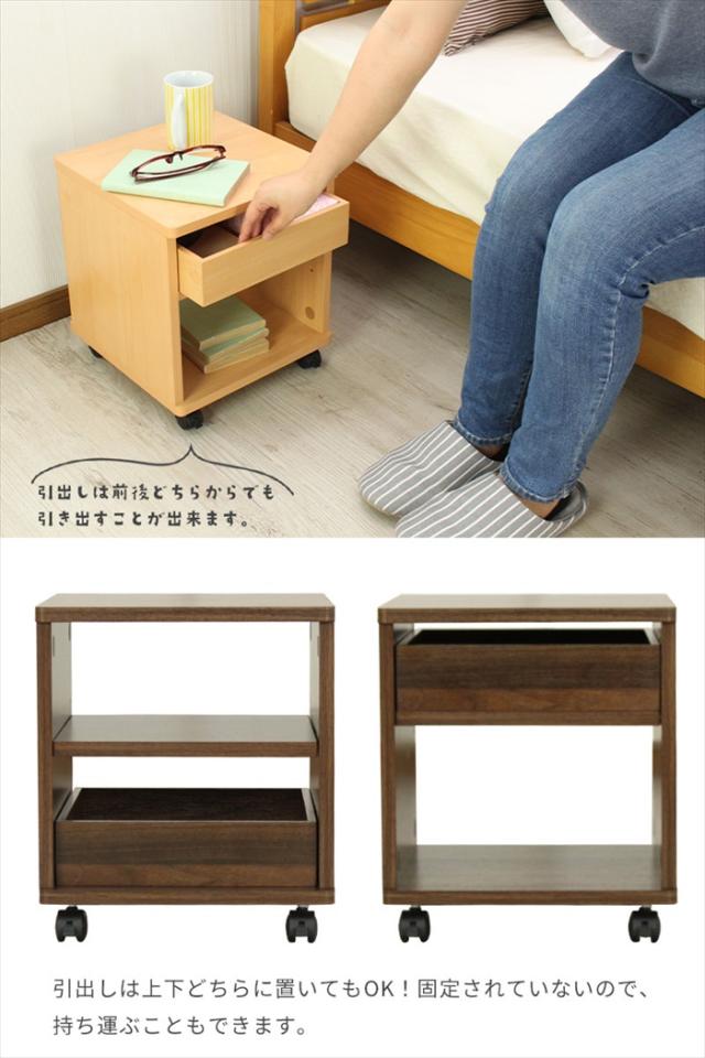 | ベッドやソファサイドに置いて、便利に使えるサイドテーブル。 引出し収納には、メモ帳やメガネなど、近くにあると便利な小物類を収納しておくのにぴったり。 引出しは前後どちらからでも引き出すことが出来ます。 棚板の上に引出しを置いたり、アレンジしてご使用いただけます。 キャスター付きなのでお掃除の際も楽々移動できます。 |