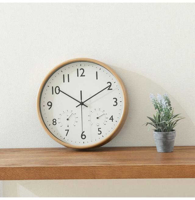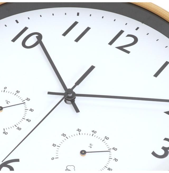 文字盤や秒針など非常にシンプルで、どんなお部屋にも合わせやすいデザインです。文字盤の左右には温度計と湿度計もついていて、お部屋の環境チェックも可能。室内での熱中症対策にも活躍できます文字盤をすべるように連続的に秒針が動き、「カチコチ音」がせずに静かです。寝室など静かな場所にも向いています。