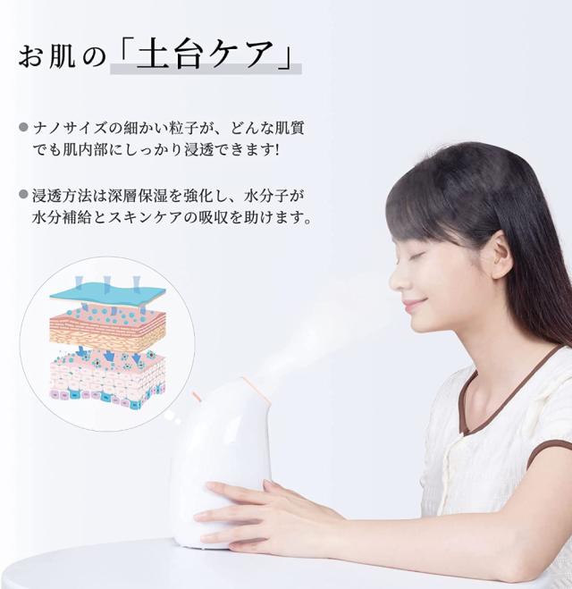 【深層補水】一年中に不可欠なスキンケアステップは保湿です。スチーマーはナノ超微粒子化技術を採用で、微細な粒子を噴出するナノ水分子で、肌への浸透力が20倍以上アップさせます。どんな肌質でも肌内部にしっかり浸透できます。美容に最適な40度の湯気で、まるで温泉の湯気のように肌に優しくうるおいを与えます。