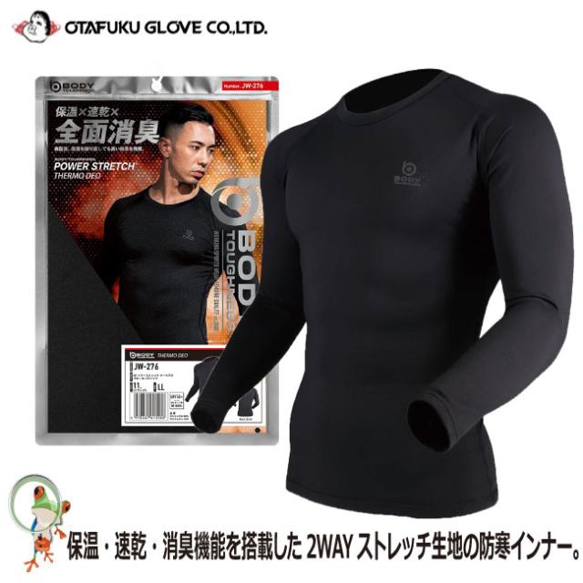 防寒インナー おたふく BT パワーストレッチ サーモデオクルーネックシャツ / JW-276 BODY TOUGHNESS ボディタフネス 紫外線軽減 ブラック【吸汗速乾 裏起毛 防寒対策 消臭作用】