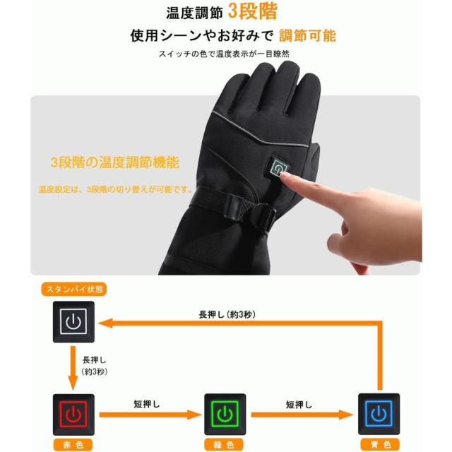 【三つの温度設定・調整が容易】5000mAhのリチウムポリマー電池を搭載した当社の電熱手袋は、温度調整は高、中、低の三段階に分けており、お好みに合わせて温度を調節できます。1高温:赤のランプが点灯し、約3時間ぐらい連続稼働できる2中温:グリーンのランプが点灯し、約6時間連続稼働できる3低温:青のランプが点灯し、約8時間ぐらい連続稼働できる。