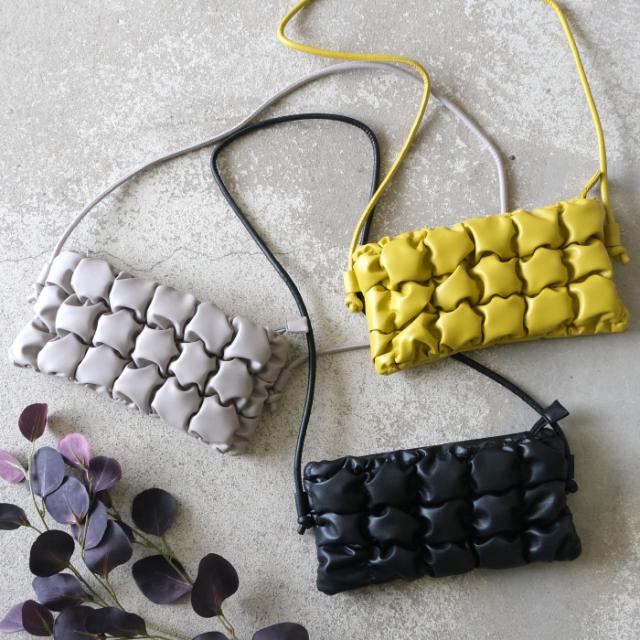 ぽこぽことした見た目が可愛いスクエアショルダーバッグ。 内側にはポケットが2つ付いていて、小さいながら収納力も◎ シンプルなコーデのアクセントにもおすすめのアイテムです。