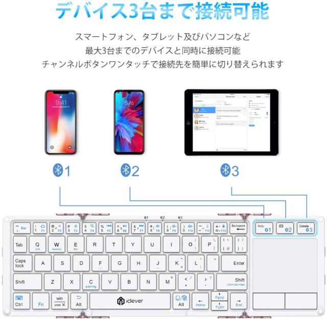 3台同時接続:第1台目の端末を接続する前にFn+A(デバイス1)を押し、FnとTab (Bluetooth接続ポタン)を長押して端末で本製品の認識「BT5.1 keyboard-1503」とペアリングすると接続完了です。第2台目 / 第3台目の接続は接続する前にFn+S(デバイス2)/ Fn+D(デバイス3)を押し、前のペアリング手順を繰り返して接続できます。Fn+ A / S / D の組み合わせで接続先を切替できます。 4システム対応:本製品はiOS / Windows / Android / Macに対応しています。入力のズレになった場合があったら、まず一度Fnとの組み合わせて、キーボードのレイアウトをご使用の端末のOSと一致するように設定してください。またお使いの端末によっては本製品(日本語配列)は英語配列キーボードとして認識されてしまう場合も文字の入力がずれている可能性があります。その場合は使用端末から外接のキーボードのレイアウトを日本語配列に設定したら、印字通りに入力できるようになります。