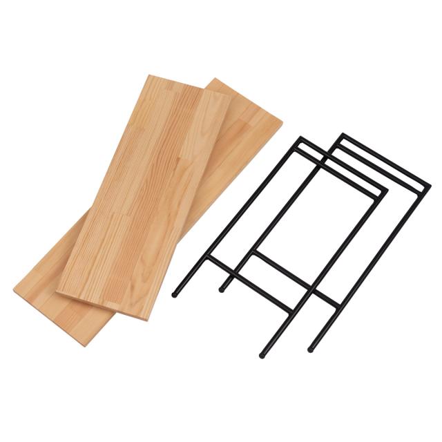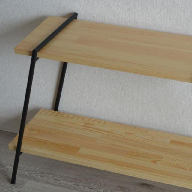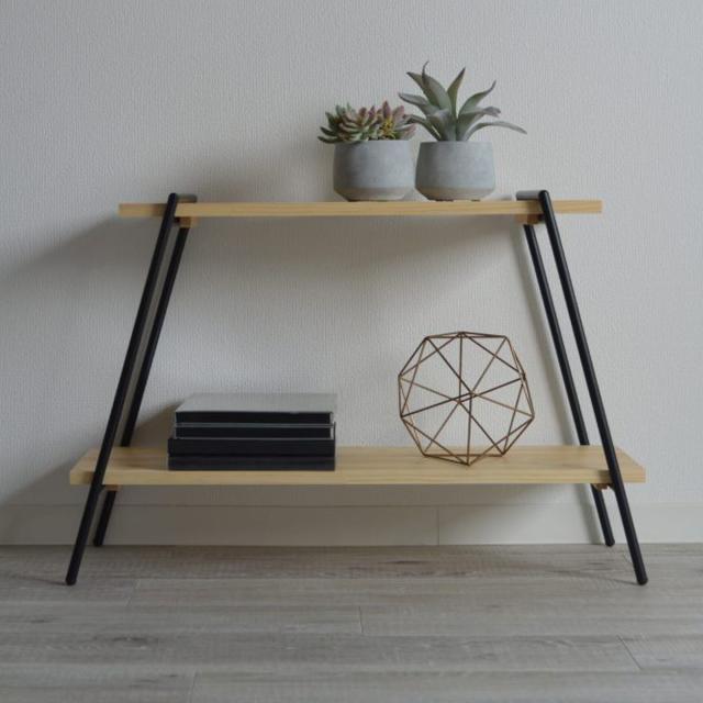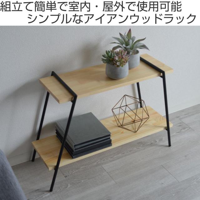 温かみのある天然木パインとアイアンフレームの空間に馴染みやすい2段ラックです。工具不要で簡単に組立てが可能です。室内だけでなくアウトドアラックとしてもお使いいただけます。