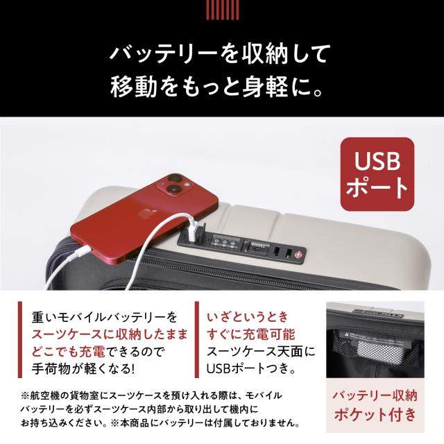 【USBポート内蔵で旅をもっと身軽に】また、本商品は移動中に重いモバイルバッテリーを持ち歩かず、お客様ご自身のモバイルバッテリーを収納して内蔵コードと接続することによりスーツケース天面から電源を取れる仕様です
