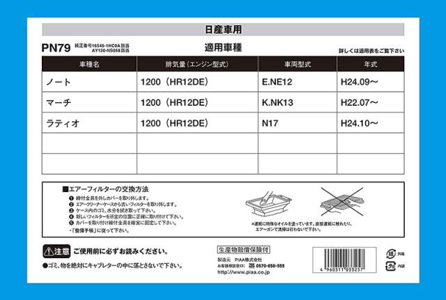 PIAA/ピア エアーフィルター 純正交換タイプ ノート NE12系等 日産系 ビスカスタイプ(湿式) エンジン性能向上 PN79