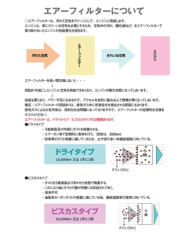エンジンは、常にクリーンな空気を必要とする為、空気中の汚れ(酸化鉄など)をエアーフィルターで取り除かないとエンジンの性能悪化を招きます。