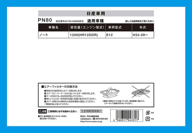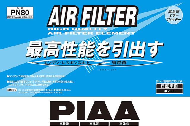 PIAA/ピア エアーフィルター 純正交換タイプ ノート E12系等 日産系 ビスカスタイプ(湿式) エンジン性能向上 PN80