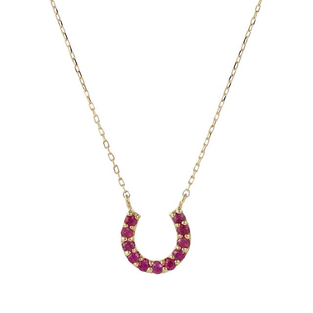 7月の誕生石でもあるルビーを、幸せをキャッチすると古くから言い伝えのある馬蹄デザインのネックレストップにしました。
