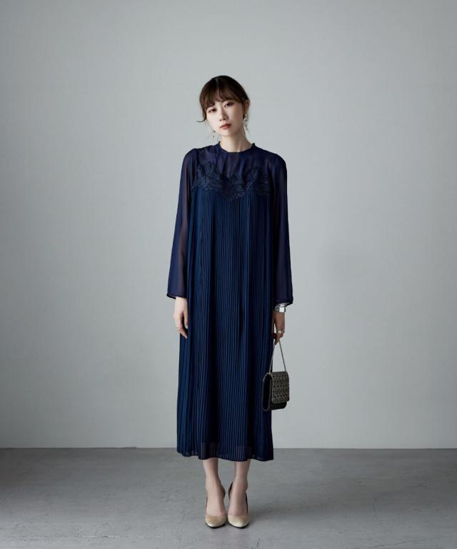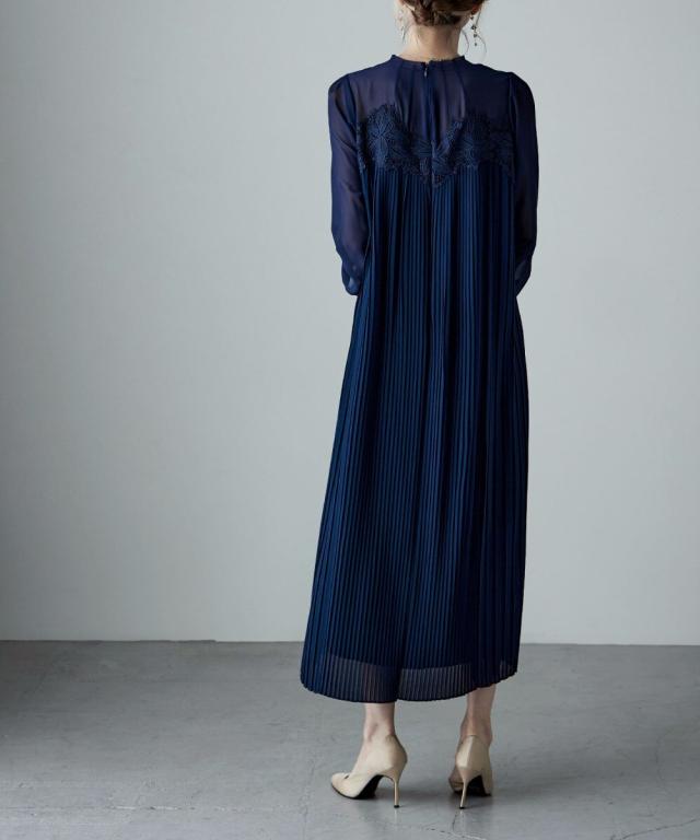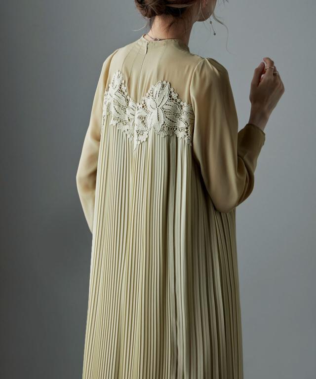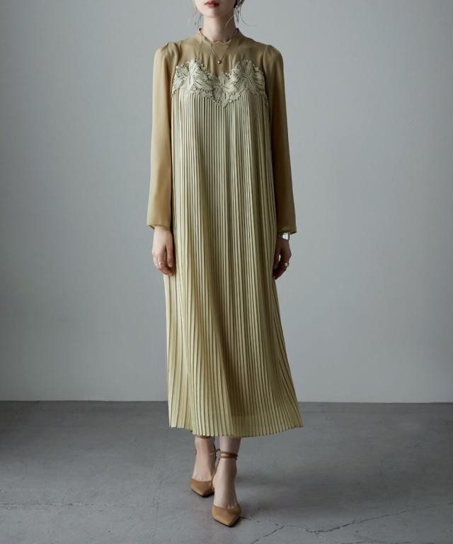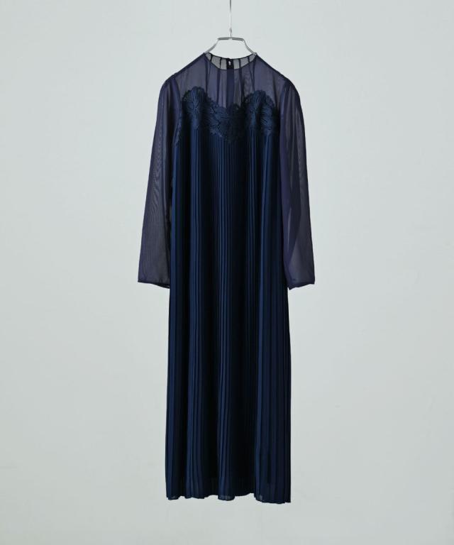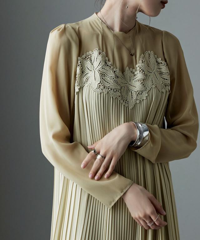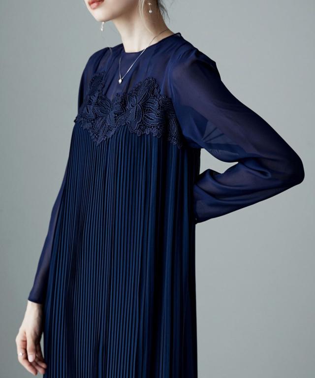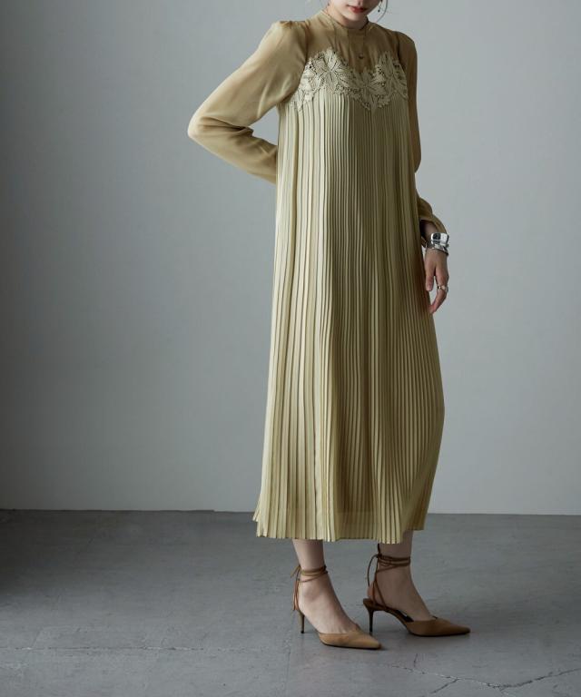 etoll. エトル 胸元の繊細なカットワークレースが施されたプリーツドレス。