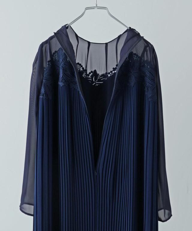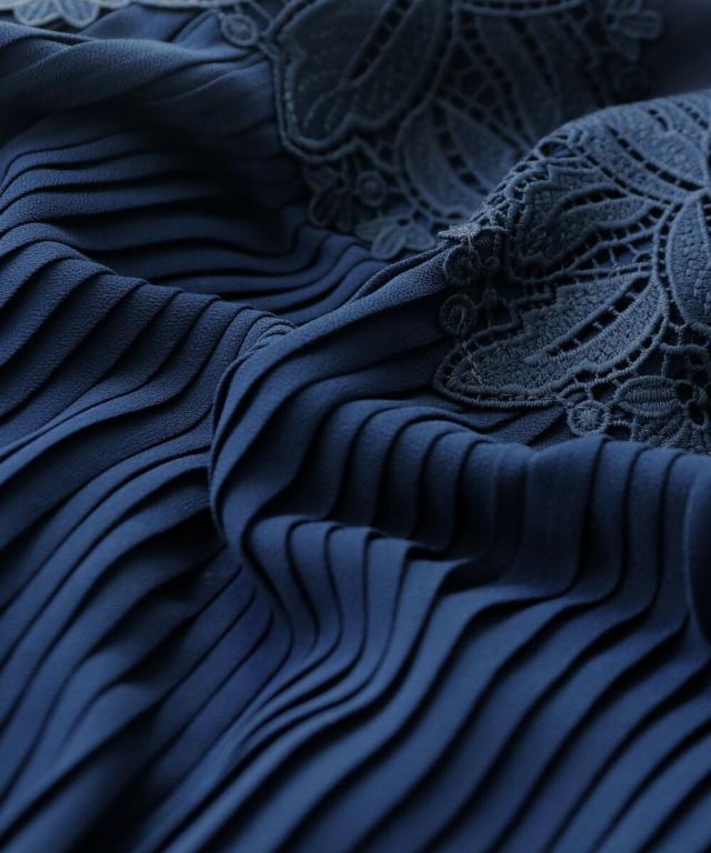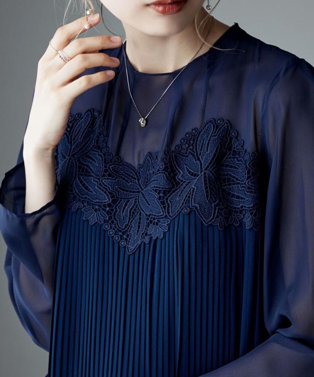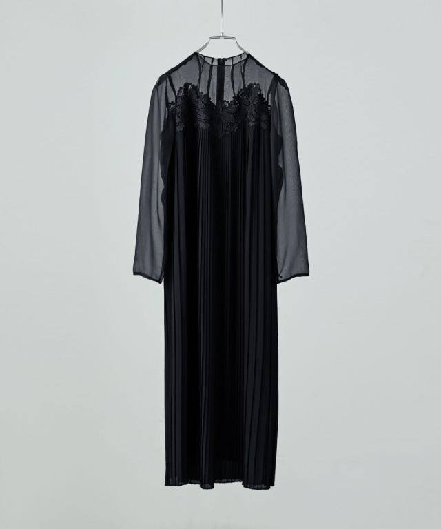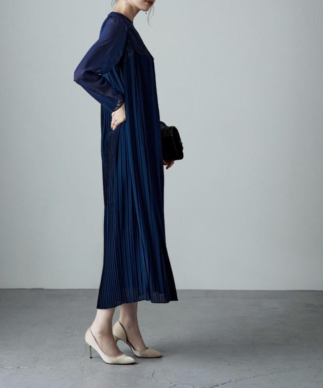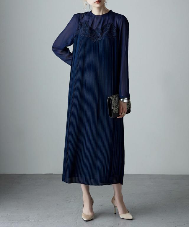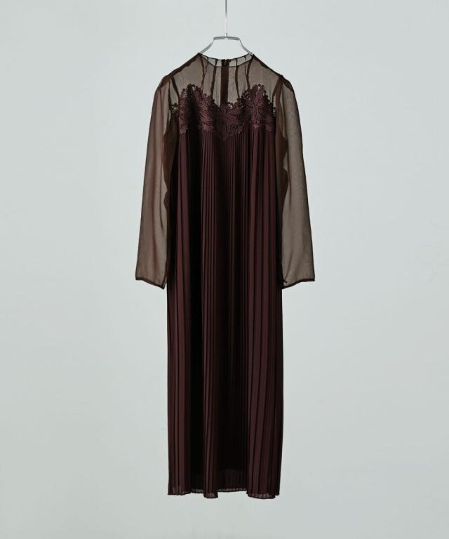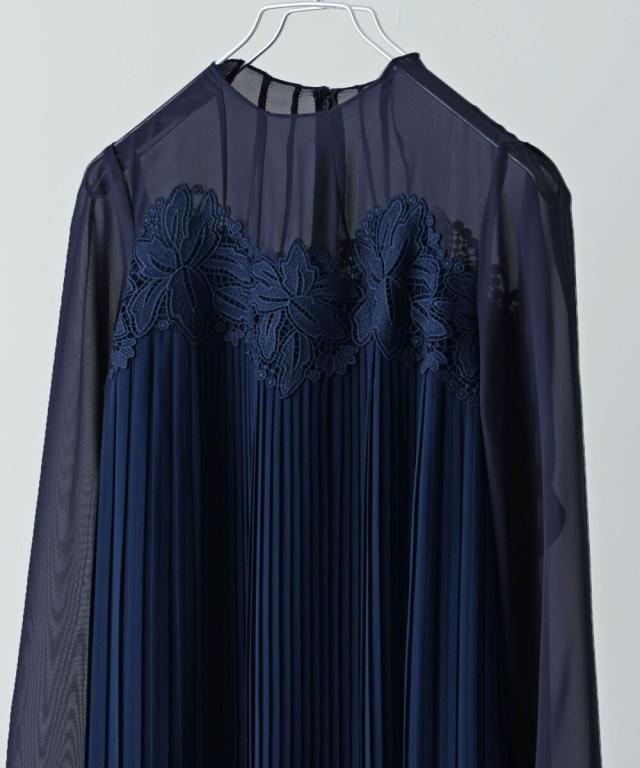 etoll. エトル 胸元の繊細なカットワークレースが施されたプリーツドレス。