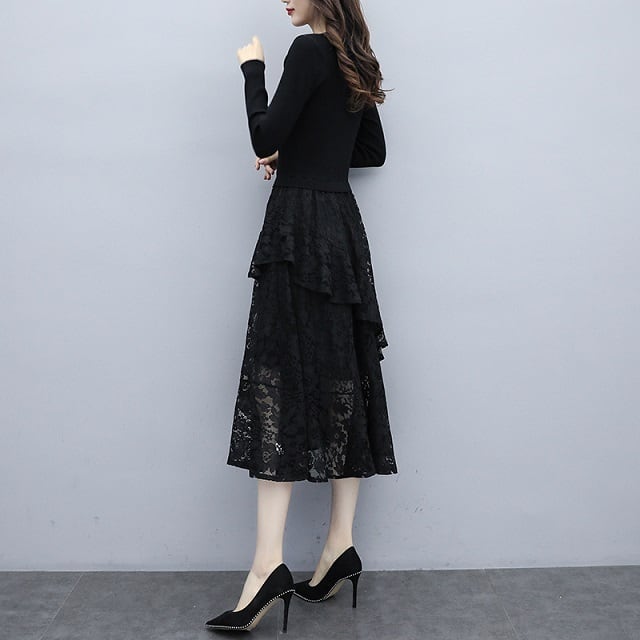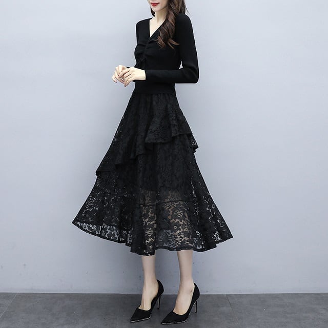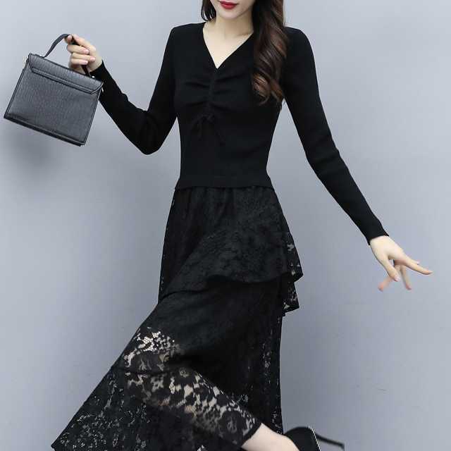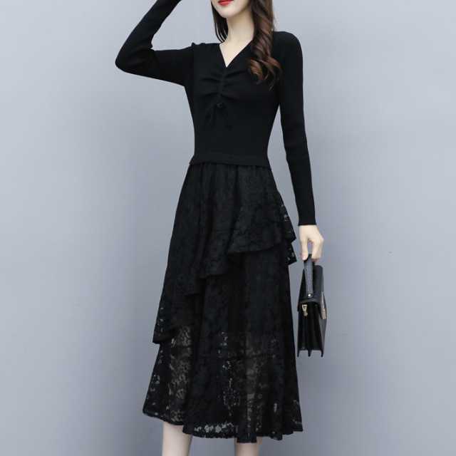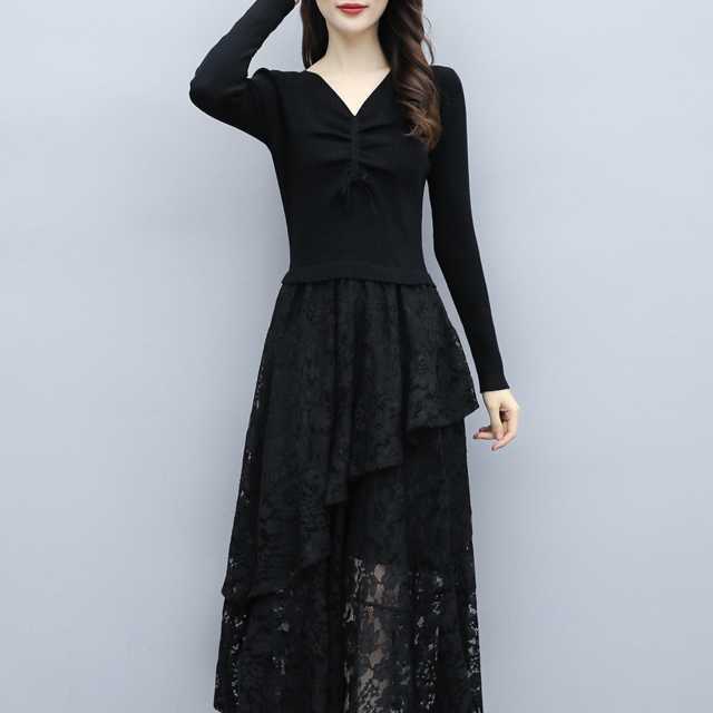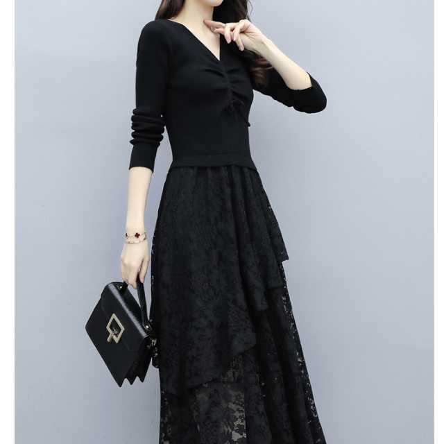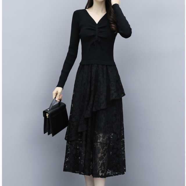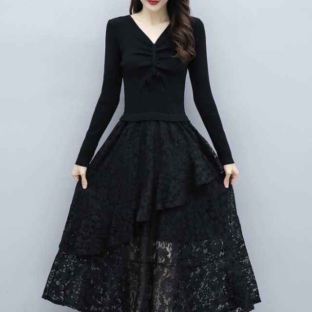 ドレス ワンピース レース パーティードレス 長袖 膝下丈 ミディ丈 ハイウエスト フレア エレガント Vネック スリム おしゃれ パーティー フォーマル トレンド 秋 冬 キレセク
