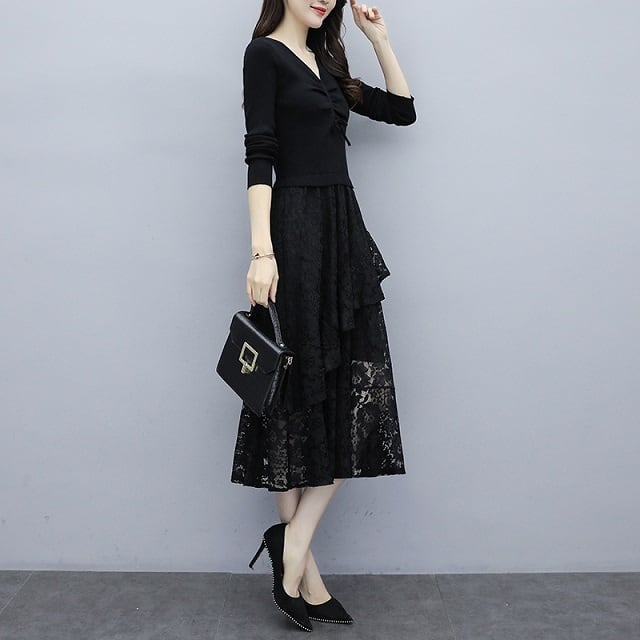 Vネックですっきりとした印象のトップスに、華やかなレース生地を重ね合わせた裾がとってもお洒落なデザインワンピース♪