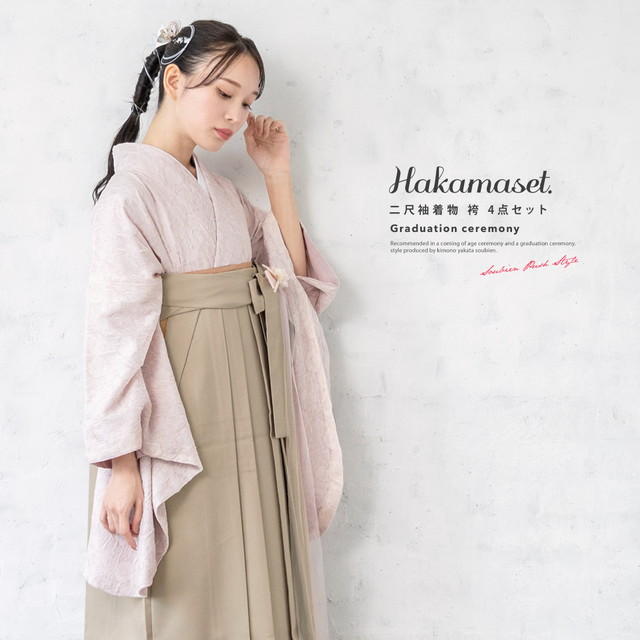 袴セット 卒業式 大学生 小学生 レディース ライトピンク系 花唐草 しわ加工 ベージュ 袴4点セット 和装 着物セット 販売 購入 送料無料