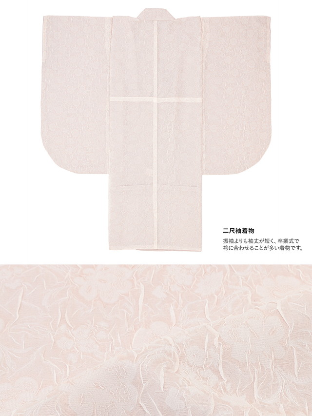 着物は、透け感のある生地に立体的なシワ加工で、ボリュームのある花々を浮かび上がらせた華やかなデザインです。