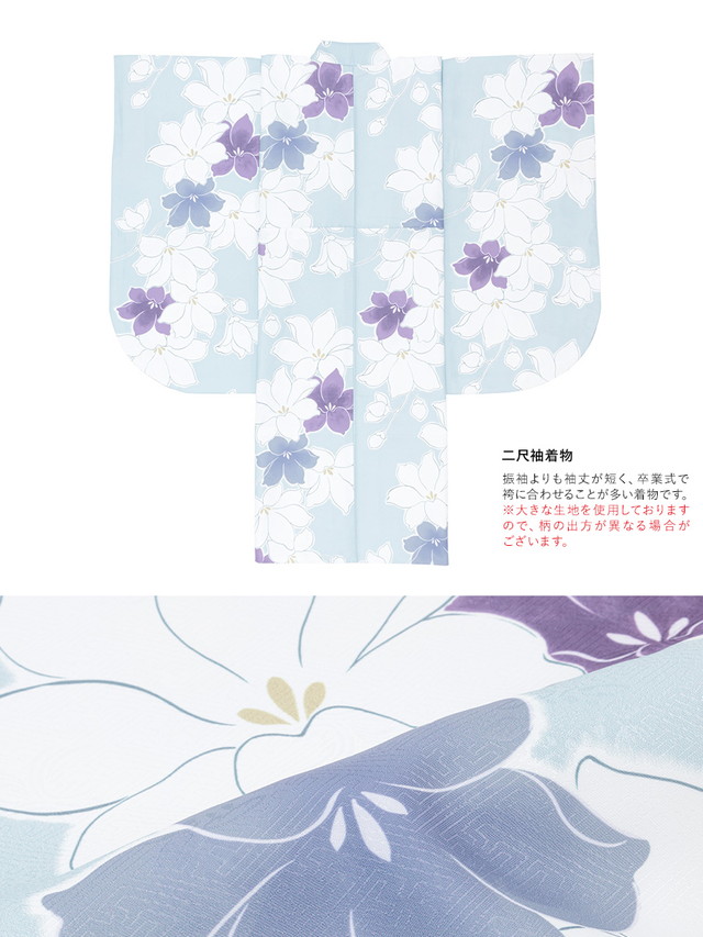 ※着物の柄部分は大きな生地を使用して作られておりますので、色や柄の出方、模様の配置等が画像と異なる場合がございます。