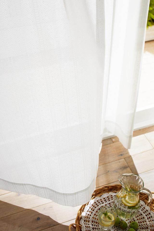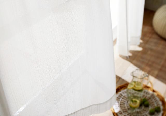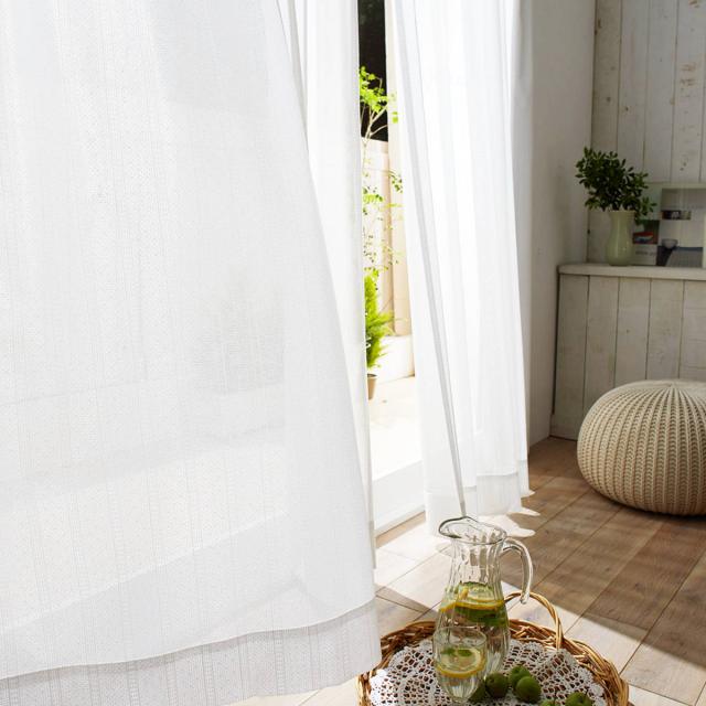 ドットとストライプ模様がさりげなくあしらわれたデザインです。お部屋に馴染むシンプルな配色で、どんなドレープカーテンにも合わせていただけます。北欧風インテリアやナチュラルテイストのお部屋にはもちろん、カラフルなインテリアに合わせるのにも最適です。