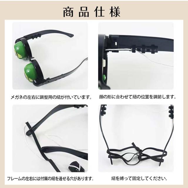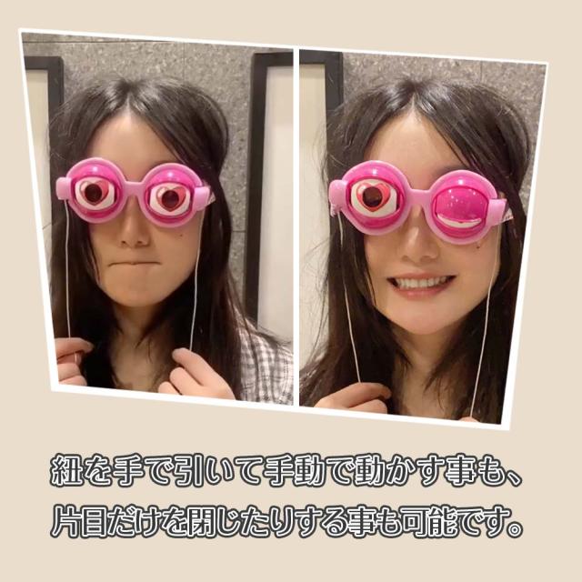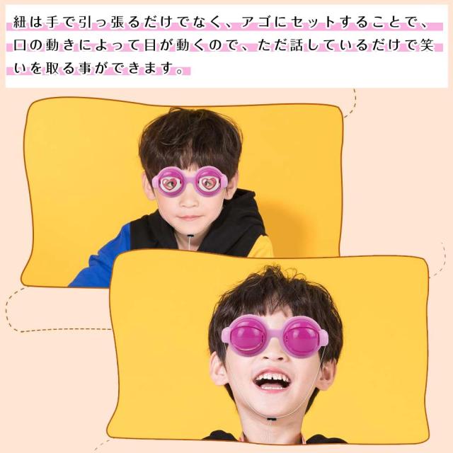 ●紐は手で引っ張るだけでなく、アゴにセットすることで、口の動きによって目が動くので、ただ話しているだけで笑いを取る事ができます。会話に連動して目が動くので、ただ話しているだけで笑いを取る事ができます。