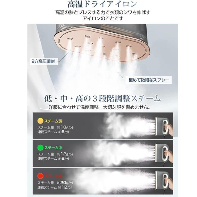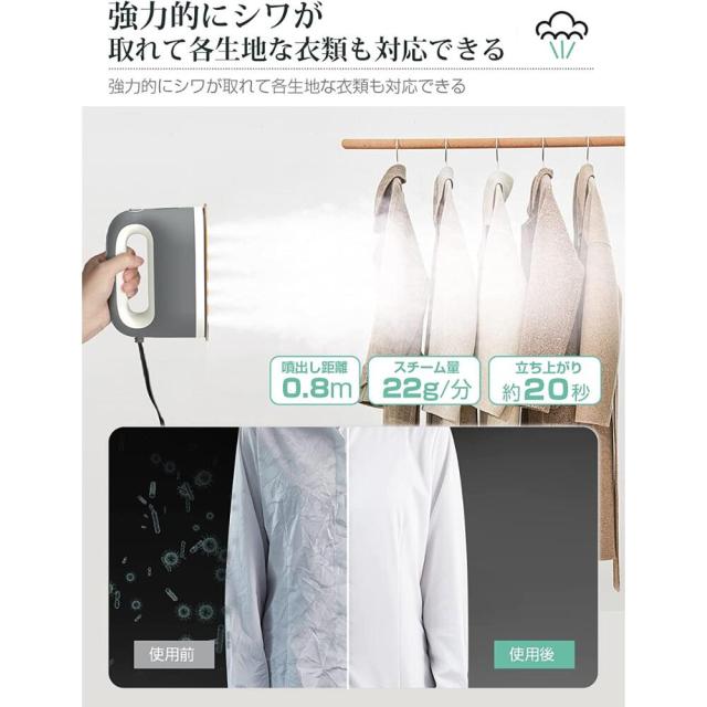 【超強力 長持続力スチーム&20秒素早く立ち上がり】衣類スチーマーの噴射する蒸気は22g/分としっかりシワを落とすスチーム量、9孔のスチームが広範囲に多く展開されることに加え、噴出できるスチームの範囲が広がり、シワ伸ばしの時間を短縮できるし、衣類全体をムラなくキレイにシワ伸ばしできながら、ハイパワースチームで除菌*消臭、衣類についた花粉やアレル物質の軽減にも役立ちます。 「軽量」本体が640gだけ、手元の負担を軽減する手元重心設計のため、片手で持っても楽にアイロンかけます。専用スタンドが付き、置き場所に困りません。