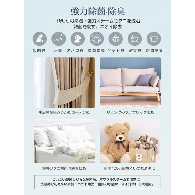【ウイルス・菌:99.9%以上除去】 水と熱だけの蒸気の力で、安心安全に部屋中の布製品のお手入れができます。脱臭、花粉・アレル物質低減、殺ダニ効果も一人暮らしの部屋に収納しても場所を取らず、旅行バッグに入れてもかさばらないので、自宅用だけでなく、携帯アイロンとして旅行先や出張先にも楽々持ち運べます。