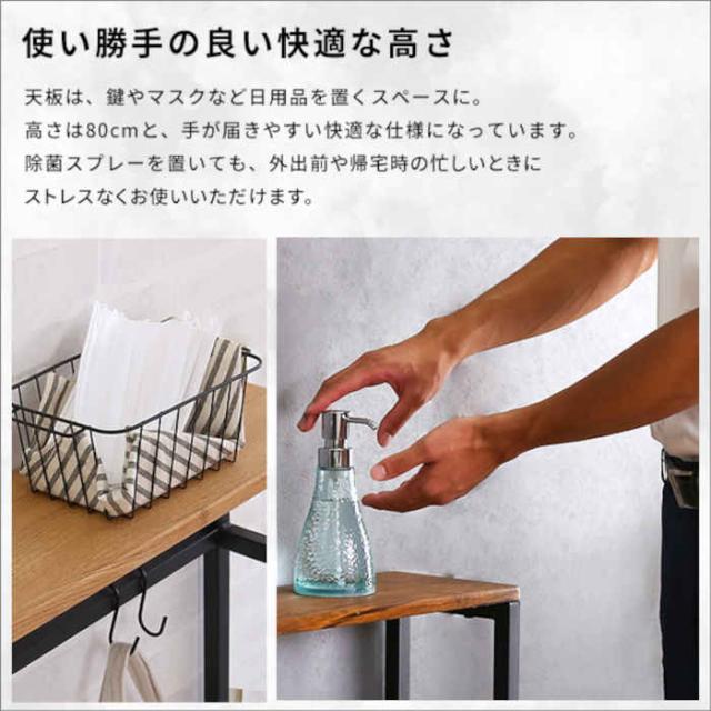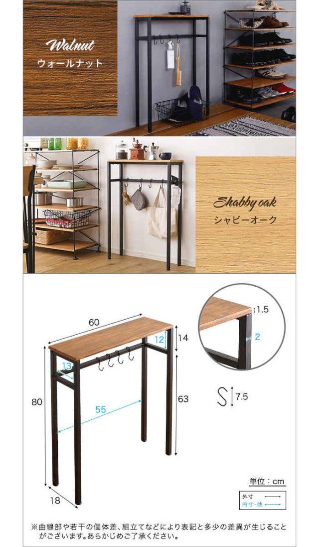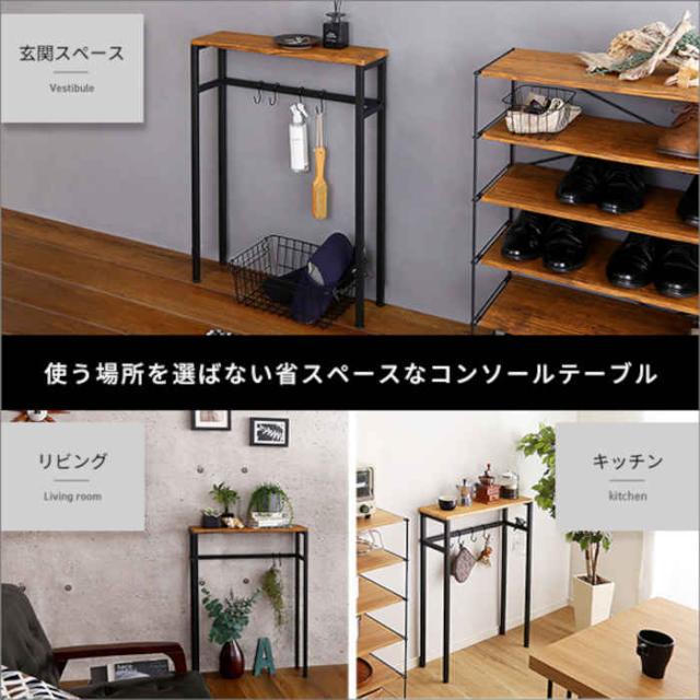 狭い玄関前、ちょっとしたスペースを活用したコンソールテーブル。カラーは、ウォールナット(4535306206529:CLT-60--WAL)、シャビーオーク(4535306206536:CLT-60--SBO)です。シンプルで使いやすく、鍵やマスクを持ち出しやすい場所に置けます。天板下はフックを付属しているので、折りたたみ傘やエコバックなど、お出かけの際にあったらいいなというものを収納できます。がたつき防止のアジャスター付。