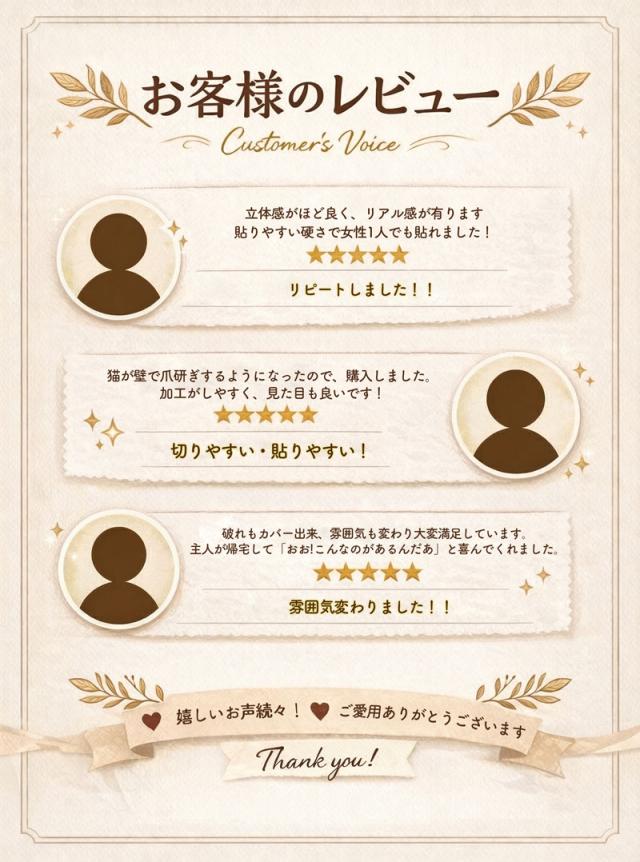 - 1人で貼れますが、2人でした方が楽かもしれません。凹凸がリアルで良い感じでした。 ただ、裏紙を剥がすのに、綺麗に剥がす事が出来ない部分もありました。