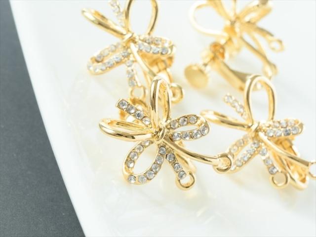イヤリングパーツ ニッケルフリー 変色防止加工済 リボン アクセサリー パーツ ゴールド 22mm 10ペア ストーン付 金属アレルギー対応 問屋
