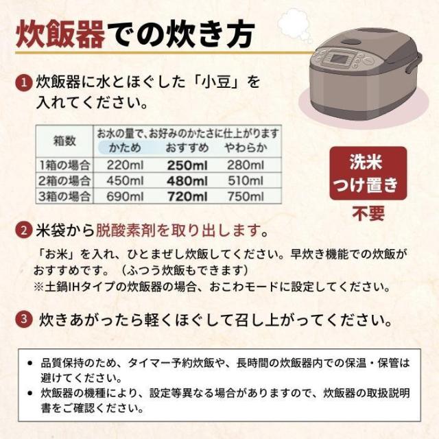 | セット内容 | 【1箱】 ・乾燥米飯 240g ・丹波大納言小豆 40g ・ごま塩 3g |