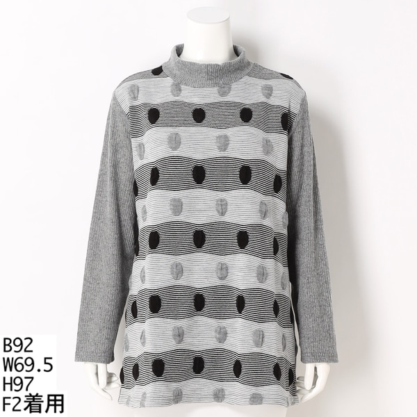 身頃のぽこぽことしたのリズミカルな水玉模様と基調カラーのグロやグレーのリブがほっそり引き締め効果です。