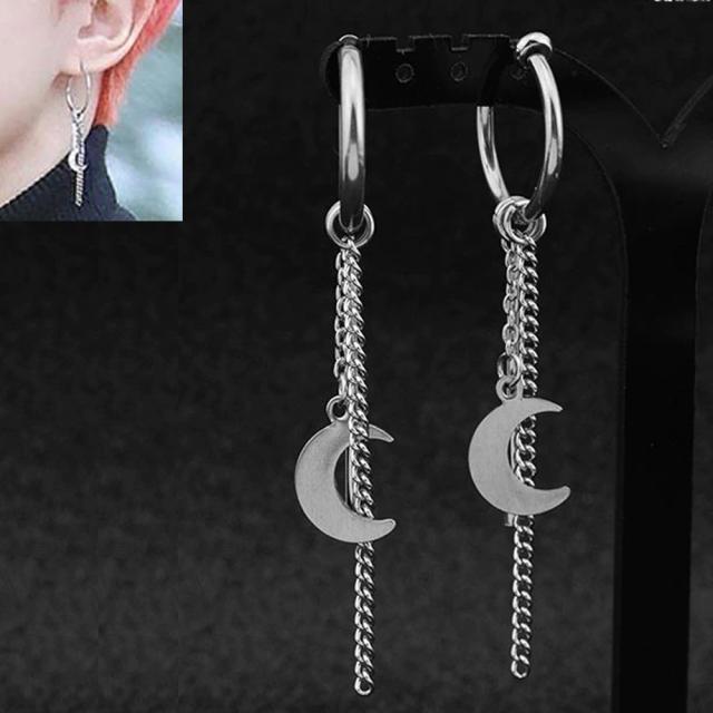 シンプルなリングピアスやスプリング(バネタイプ)のノンホールピアスに三日月型のムーンと円柱型の棒と鎖チェーンのチャームをセットしたアイテム。