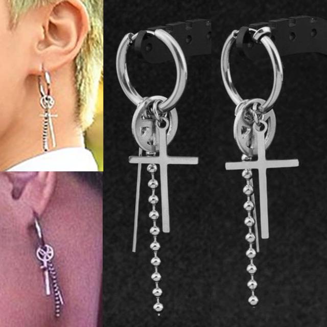 シンプルなリングピアスやスプリング(バネタイプ)のノンホールピアスに十字架と平和のロゴのピースマークシンプルな棒状のスティック、クサリチェーンでも人気のボールチェーンのチャームをセットしたアイテム。