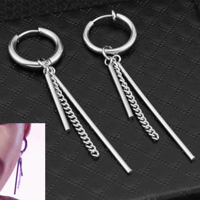 シンプルなリングピアスやスプリング(バネタイプ)のノンホールピアスに2本の棒状のスティック、クサリチェーンでも人気のキヘイ型のチェーンのチャームをセットしたアイテム。