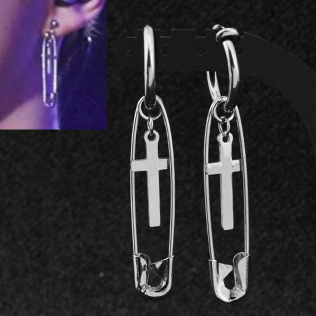 シンプルなリングピアスやスプリング(バネタイプ)のノンホールピアスに十字架が揺れる安全ピンのチャームをセットしたアイテム。