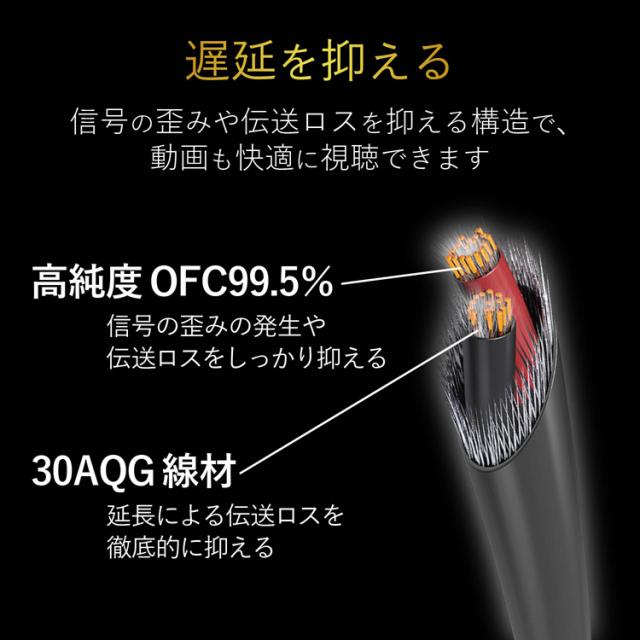 ●断線に強く、8万回の屈曲試験※に合格した高耐久モデルのヘッドホン・イヤホン用延長コードです。※メーカー基準配線内部の密度を高め、屈曲に対する耐久力を強化する95%編組シールドを使用しています。内部線材どうしの摩擦による劣化を防ぐフィラーを内蔵しています。太く頑丈な30AWG線材を使用しています。高純度OFC99.5%仕様により、信号の歪みの発生や伝送ロスを抑えます。コネクタには、通常よりブッシュを長くすることでプラグ部分にかかる負担を軽減するロングブッシュ構造を採用しています。耐久性が高く、スマートフォン・オーディオプレーヤー本体を操作する際に邪魔になりにくいL字コネクタを採用しています。サビや信号の劣化を防止する金メッキプラグを採用しています。コードの長さは持ち運びに便利な1mです。